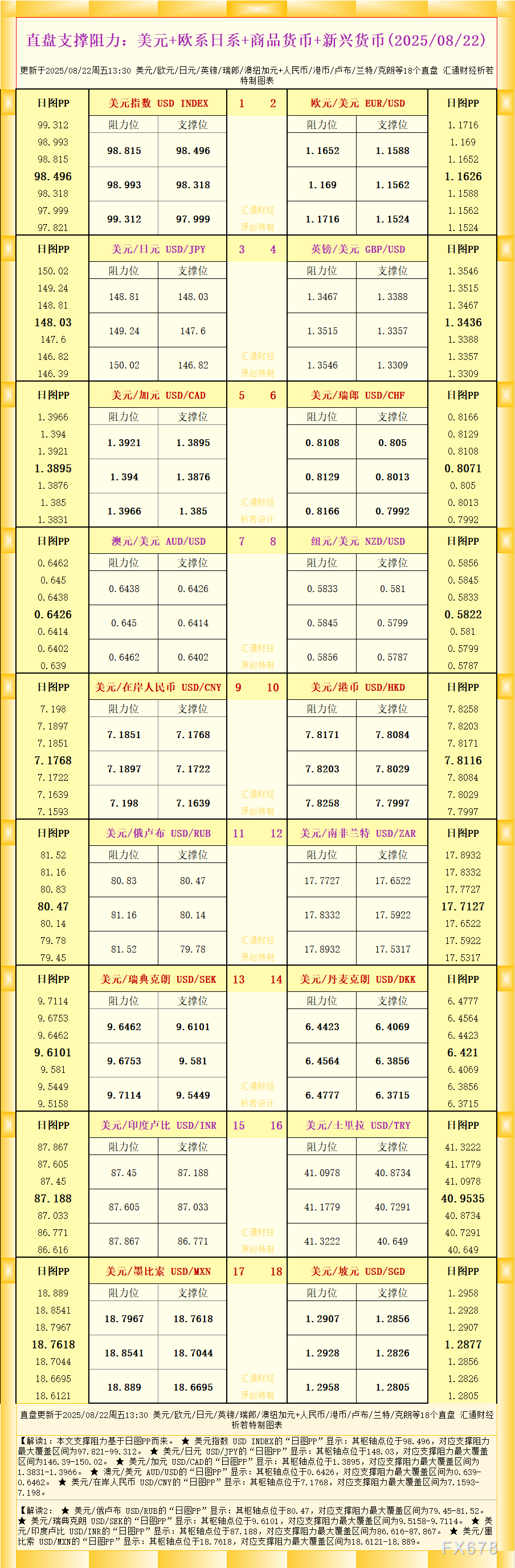 汇通财经APP讯——一张图看直盘支撑阻力:美元+欧系日系+商品货币+新兴货币配资天眼线上站,更新于2025年8月22日周五13:30,具体美元/欧元/日元/英镑/瑞郎/澳纽加元+人民币/港币/卢布/兰特/克朗等18个直盘,更多详见汇通财经析若特制图表中的内容。